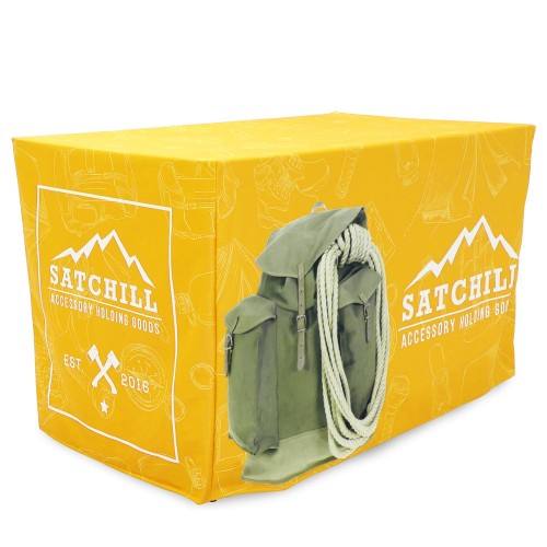 New 4 ft. sized Fitted Table Throw! Get your graphic edge-to-edge custom printed on fitted table throw that is made to fit 4 ft. tables. This option is 4-sided, fully covering the front, back and sides of the table. Our Fitted Table Throws fit snug around the table.