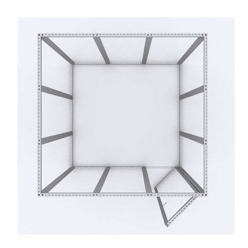 Modco Modular Display 6 is a three-dimensional 10’ x 10’ pre-designed exhibit room. Stylish and lively, this room is built using tool-free perforated modular aluminum frames. Multiple size frames connect using toolless pin connectors. The room features a door w/ lockset and key to complete your meeting room. Perforations are completely covered for a flawless finish.